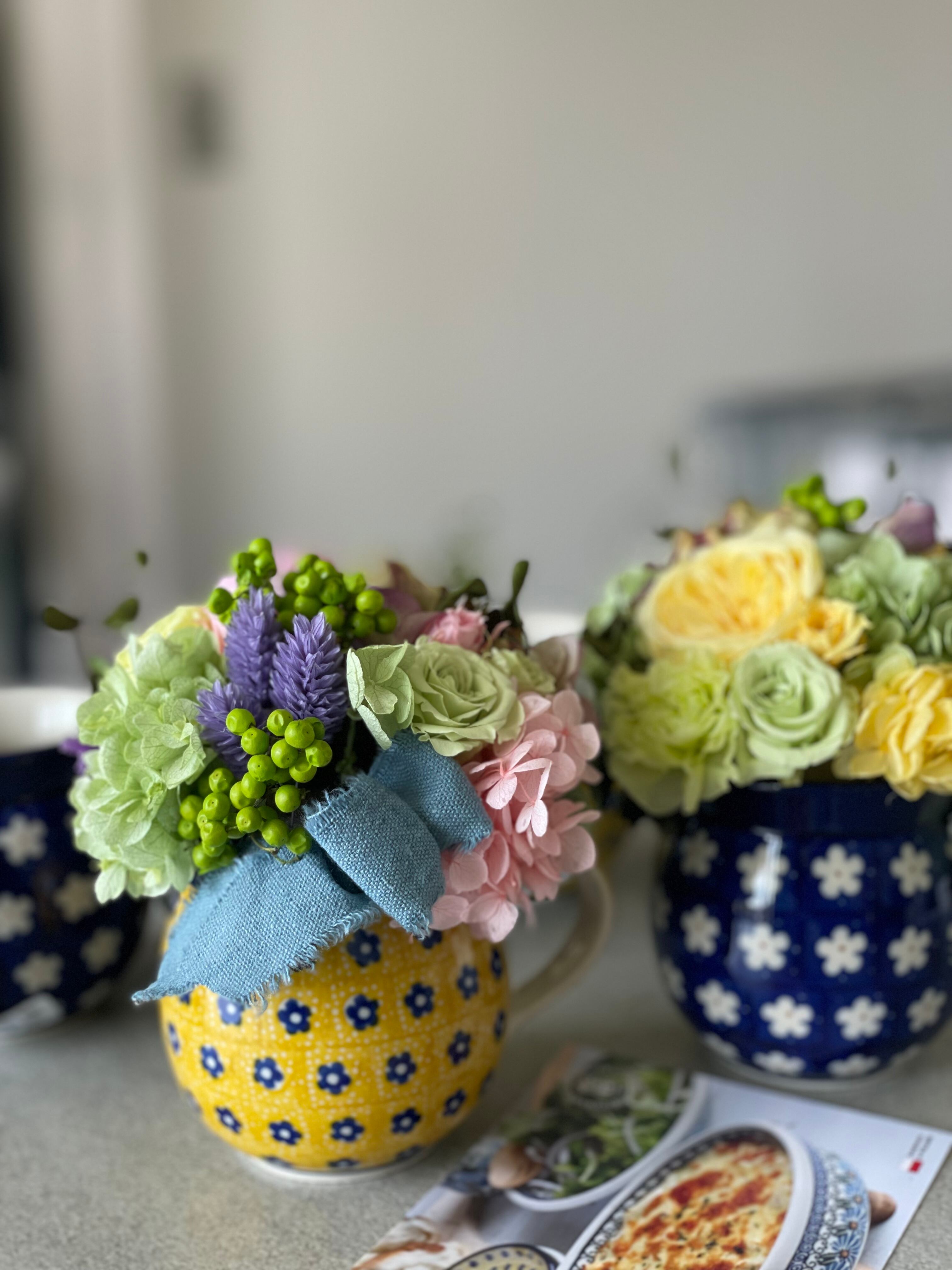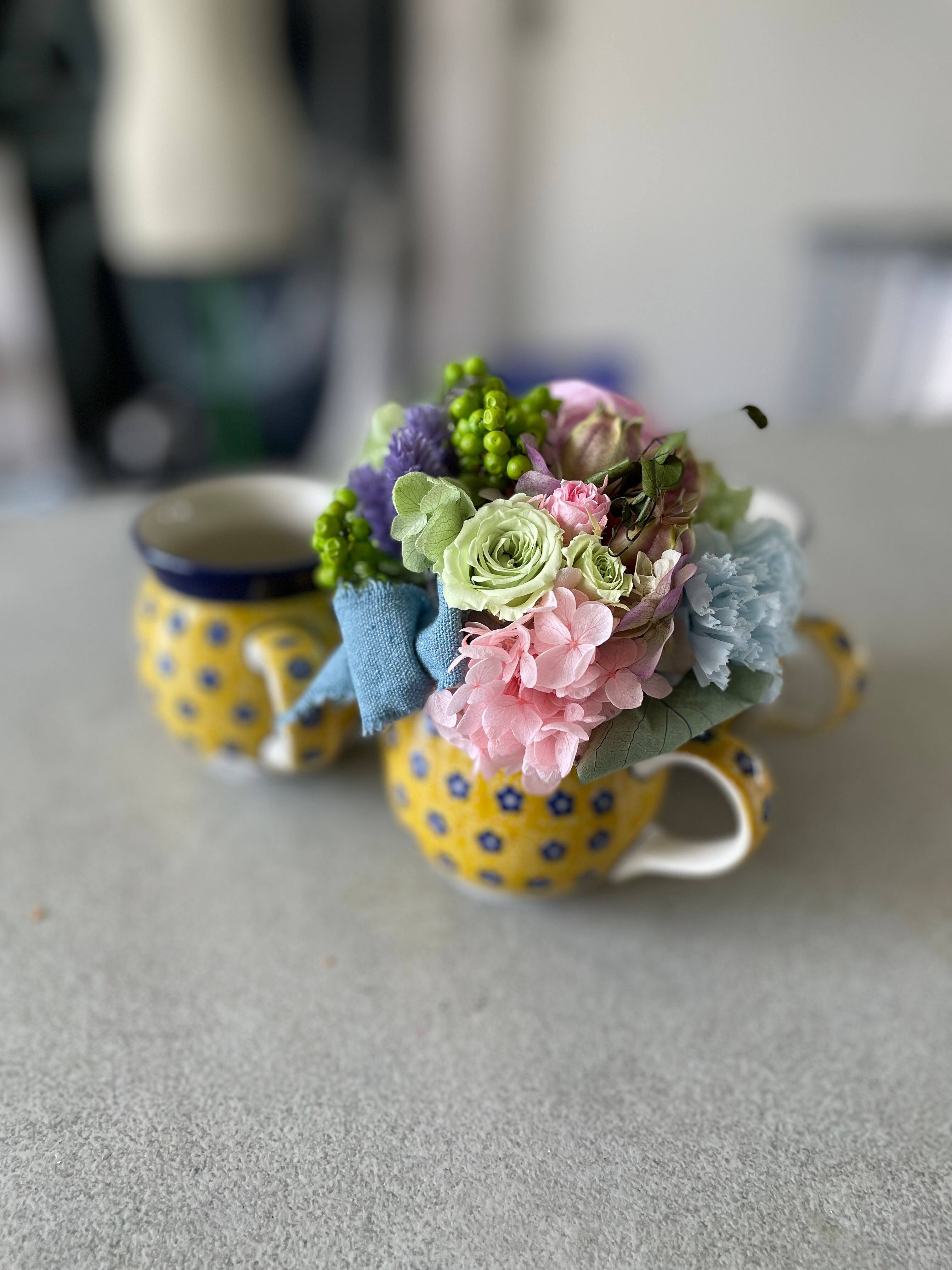 ツェラミカ アルテイステイチナ【老舗ポーランド食器】にアレンジされたプリザーブドフラワーのアレンジです。世界に一つだけの贈り物。