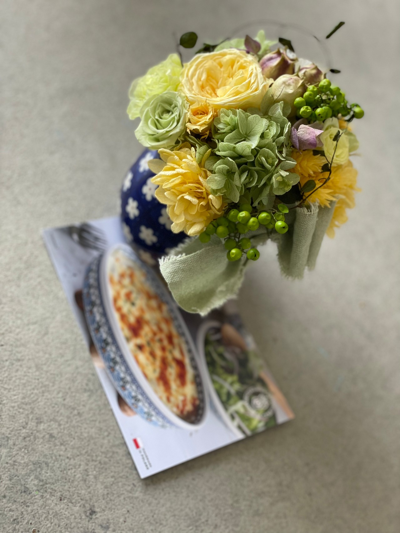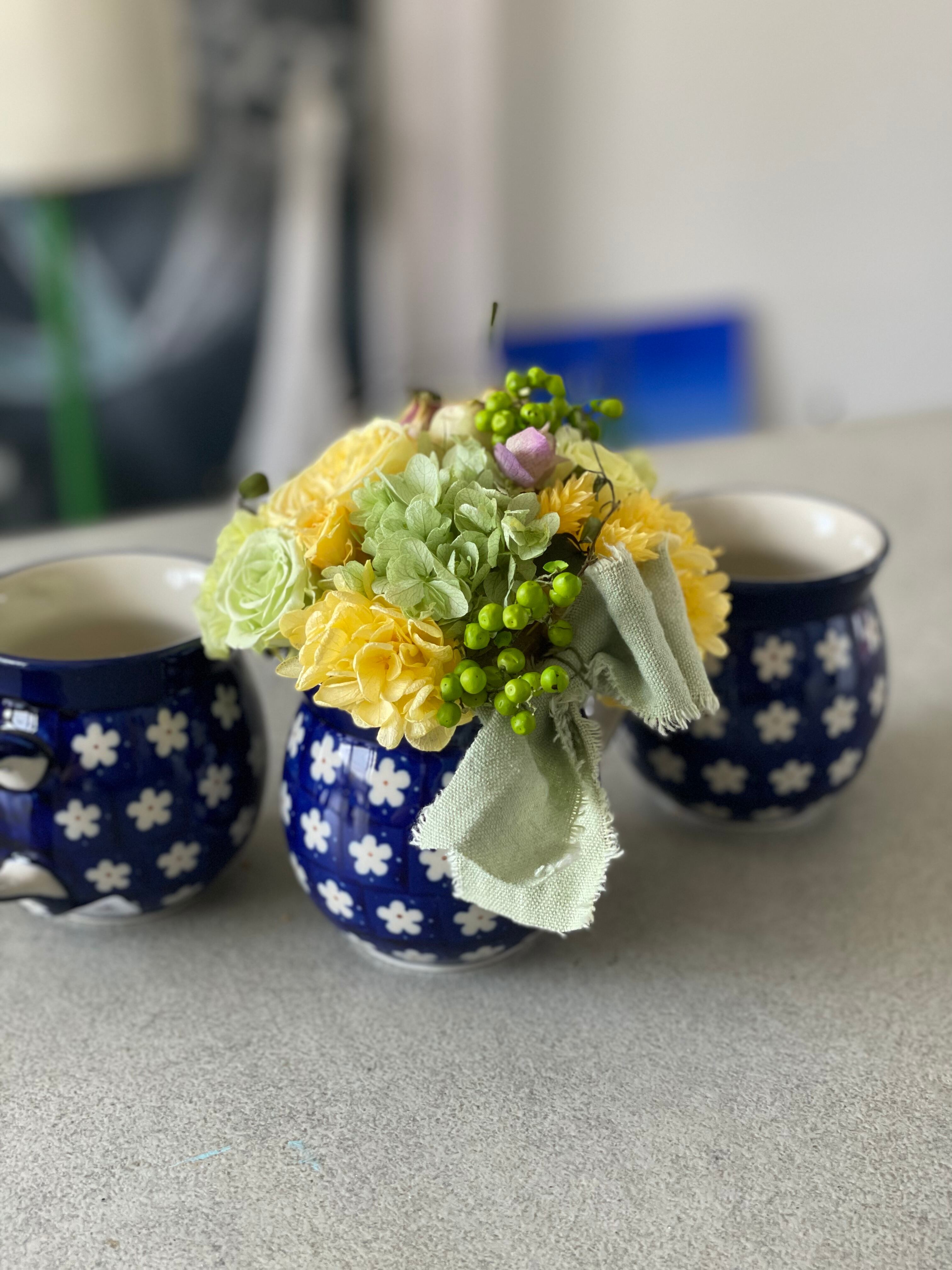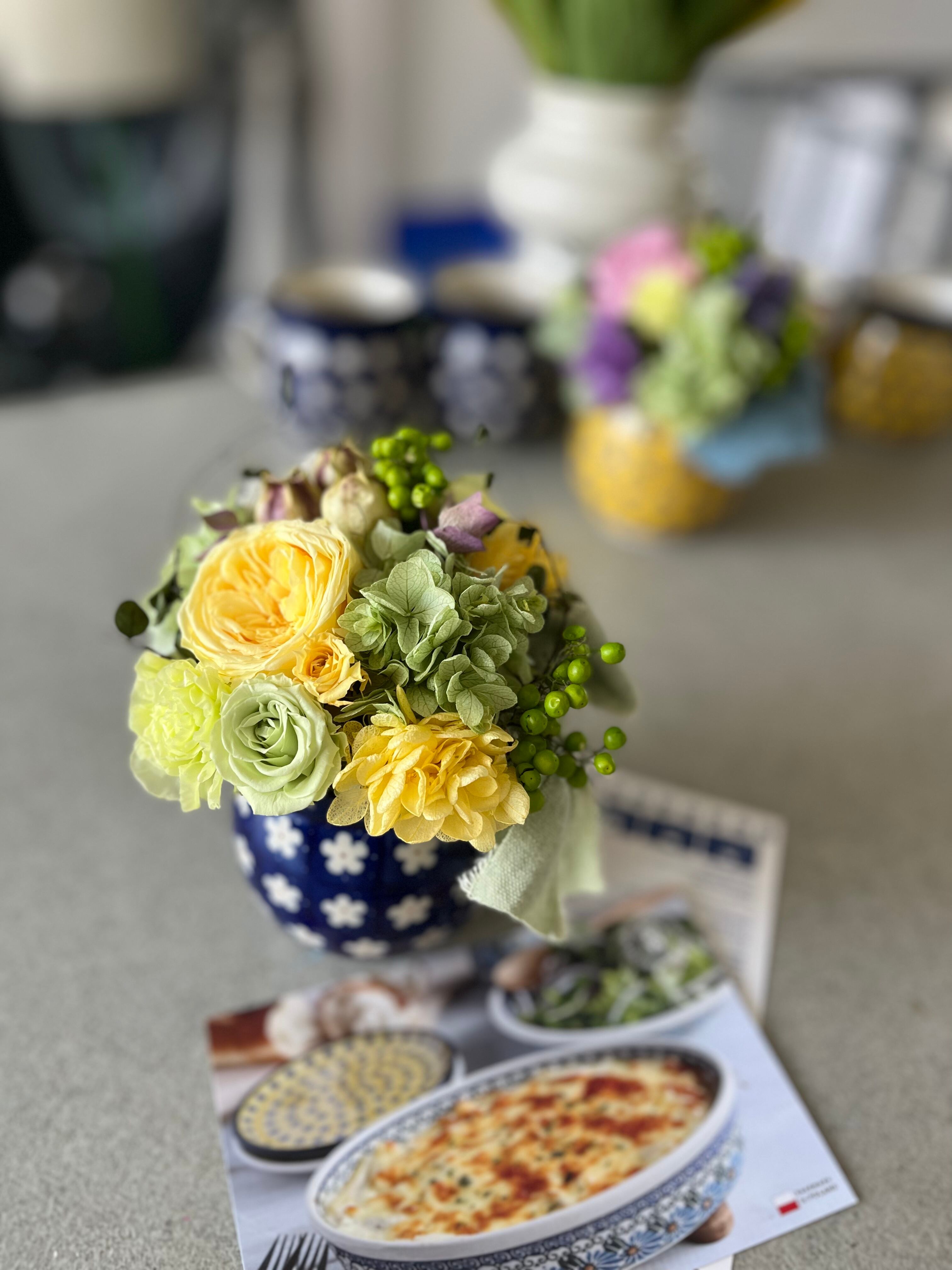 ツェラミカ アルテイステイチナ【老舗ポーランド食器】にアレンジされたプリザーブドフラワーのアレンジです。世界に一つだけの贈り物。
